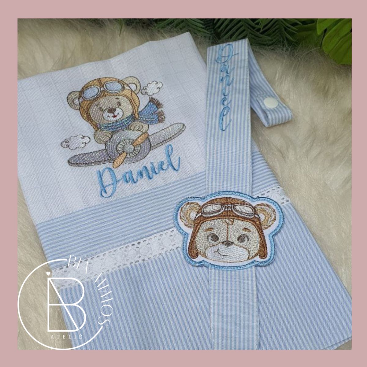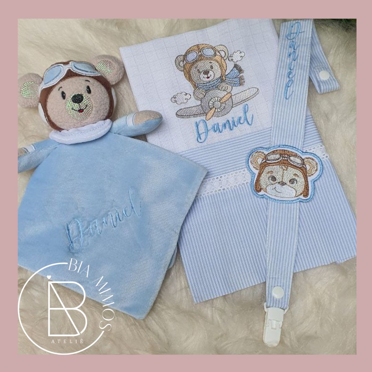 Kit Naninha Ursinho Aviador confeccionado em tecido plush , macio e fofo próprio para o bebê dormir agarradinho