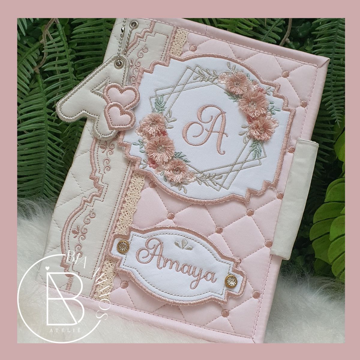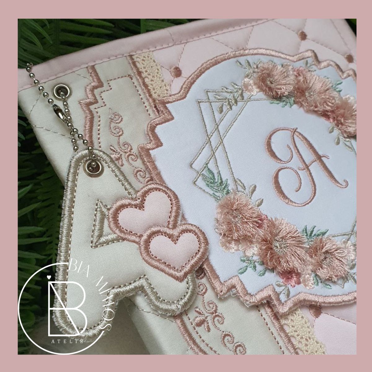Porta Caderneta Flor 3D confeccionada em tecido tricoline ,quiltada , com repartições na parte de dentro , bolso na parte de trás