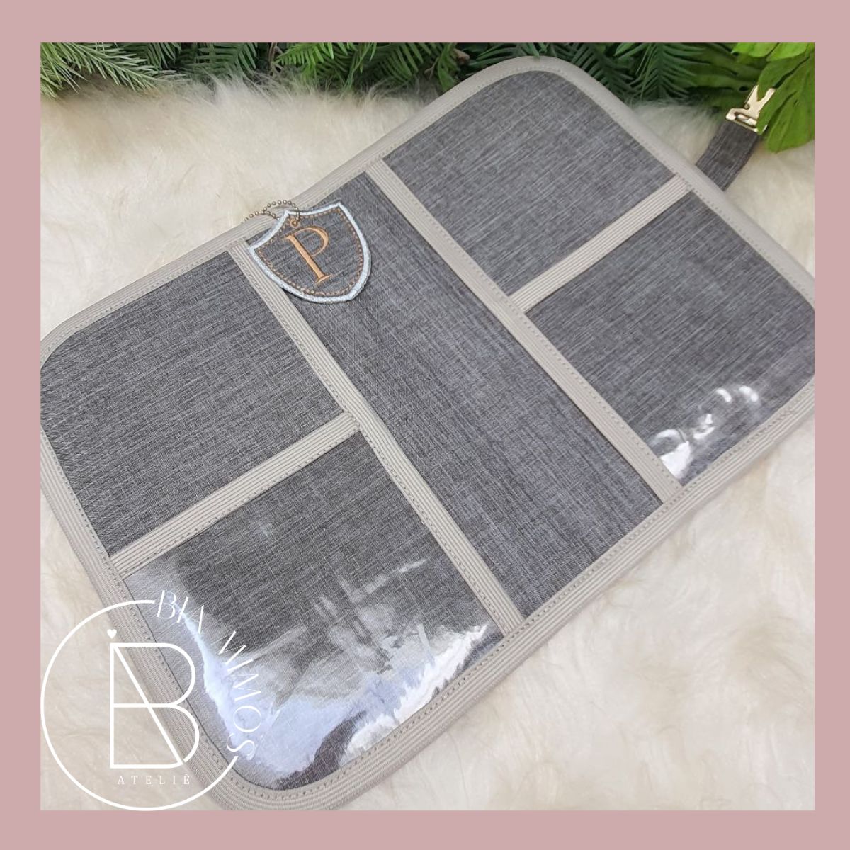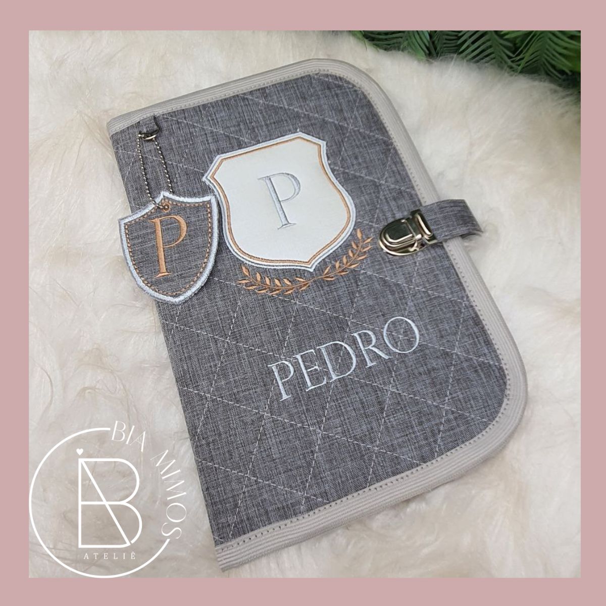 Porta caderneta de vacinas confeccionado em tecido poliéster , quiltada , fecho de luxo , com bolsos na parte interna , acompanha chaveirinho com a inicial